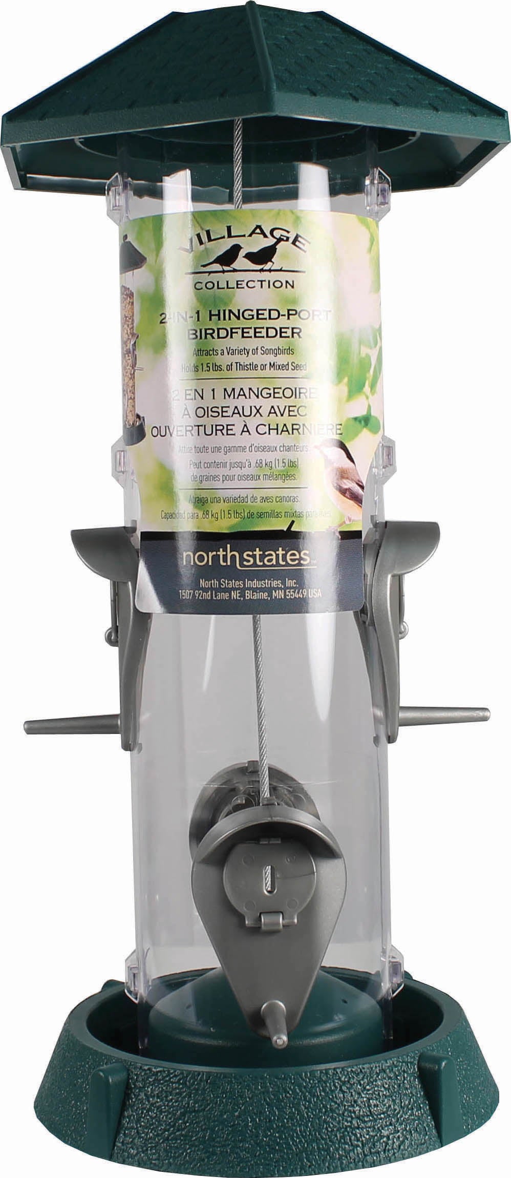 - 4 dual-purpose hinged ports flip up for thistle feed and down for mixed seed
