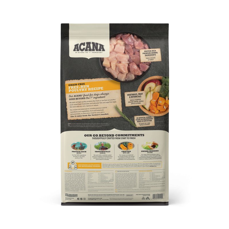 Help your dog thrive with the protein-rich, nutritious and delicious ingredients in ACANA Free-Run Poultry**** Grain Free* Dry Dog Food. This ACANA dog food contains no grain ingredients and includes added pre- and probiotics to help support your dog's digestive health. Free-run**** chicken, turkey and cage-free eggs are balanced with vegetables and fruits. This dog food kibble provides the biologically appropriate nutrition your dog needs to maintain a healthy weight with 60 percent** premium animal ingredients and 40 percent*** vegetables, fruits and nutrients. Choose ACANA dry dog food to give your companion the nutritional foundation they need to live a happy, healthy life. *Produced in a facility that also processes grains **Approximate and derived from the unprocessed state of the ingredients ***We also add vitamins, minerals, natural preservatives, flavors and probiotics ****Our free-run chickens and turkeys are not housed in cages and are able to move in a barn without outdoor access