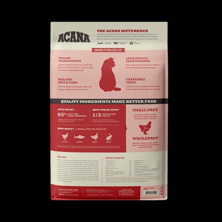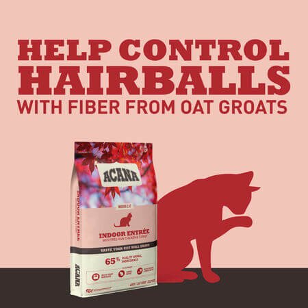 Give your indoor cat the nutrition it needs to thrive with ACANA Indoor Entree Free Run** Chicken and Turkey Dry Cat Food. Suited to the needs of domesticated cats, this dry cat food*** is crafted with free-run** chicken and turkey and whole herring, offering a burst of flavor in every bite. Rich with 65% animal ingredients* and 35% fruits, vegetables and botanicals****, this high protein cat food kibble blends protein with fiber and probiotics to help support cat digestive health. This cat food provides balanced calories from protein and fat, plus L-carnitine, to help maintain a healthy body weight. This dry cat food also includes fiber from oat groats, miscanthus grass, lentils and chickpeas to help control hairballs. *Approximate and derived from the unprocessed state of the ingredients. **Our free-run chickens and turkeys are not housed in cages and are able to move in a barn without outdoor access. ***No added grain ingredients. Produced in a facility that also processes grains. Facility does not process soy, corn, tapioca or wheat ingredients. ****We also add essential vitamins and minerals, natural preservatives and probiotics