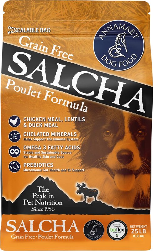 Our poultry formula is made with low ash chicken and duck. Annamaet Salcha is very palatable and has helped many dogs with sensitive skin and coat. “Salcha†is named after a small village in the interior of Alaska, where we have spent many hours formulating and testing the food. Annamaet Salcha is formulated to meet all the nutritional levels established by the AAFCO Dog Food Nutrient Profiles for All Life Stages, including growth of large size dogs (70 lbs. or more as an adult).