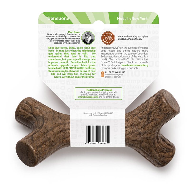 The Benebone MaplestickTougher than real sticks and flavored with real maple wood, the Maplestick is sure to upgrade your pup’s chew and fetch game.About BeneboneAt Benebone, we started with the premise that dogs experience scent and flavor in a way we can’t even grasp. So we ditched the neon colors and loud squeaks. Inspired by a dog’s powerful sense of smell, we developed a long-lasting durable chew that’s jam-packed with real maple wood for flavor. Once your dog takes a bite of our USA-made chews, he’ll be hooked.We’re Obsessed with Safety TooWonder if Benebone is right for your dog? Here’s what you need to know. Since it’s hard, it’s important that your pup has strong teeth. If you’re unsure, check with your vet. Nobody likes an unexpected trip to the dentist. Keep an eye out for wear and tear. Within a month or so, we find that most dogs chew Benebone into submission. See the wear page on our website for helpful photos to determine when to replace yours. Keep away from households with peanut or other allergies.What’s Inside?Nothing but Nylon and Real Wood for Tantalizing Flavor