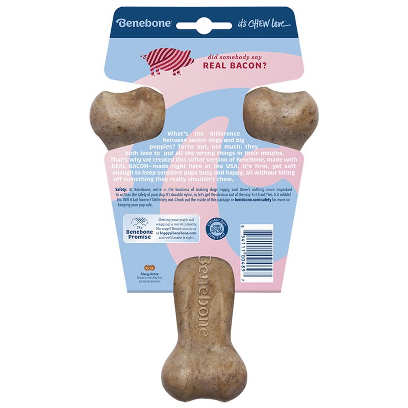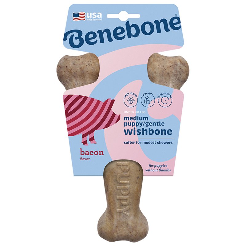 The Benebone Puppy WishbonePuppies love to chew and the dig real bacon. They deserve better than rubbery chew toys that look like they’re for babies.About BeneboneAt Benebone, we started with the premise that puppies experience scent and flavor in a way we can’t even grasp. So we ditched the neon colors and loud squeaks. Inspired by a dog’s powerful sense of smell, we developed a long-lasting durable chew that’s jam-packed with real bacon. Once your dog takes a bite of our USA-made chews, he’ll be hooked.We’re Obsessed with Safety TooWonder if Benebone is right for your dog? Here’s what you need to know. Since it’s hard, it’s important that your pup has strong teeth. If you’re unsure, check with your vet. Nobody likes an unexpected trip to the dentist. Keep an eye out for wear and tear. Within a month or so, we find that most dogs chew Benebone into submission. See the wear page on our website for helpful photos to determine when to replace yours. Keep away from households with peanut or other allergies.What’s Inside?Nothing but Nylon and Real Bacon for Tantalizing Flavor