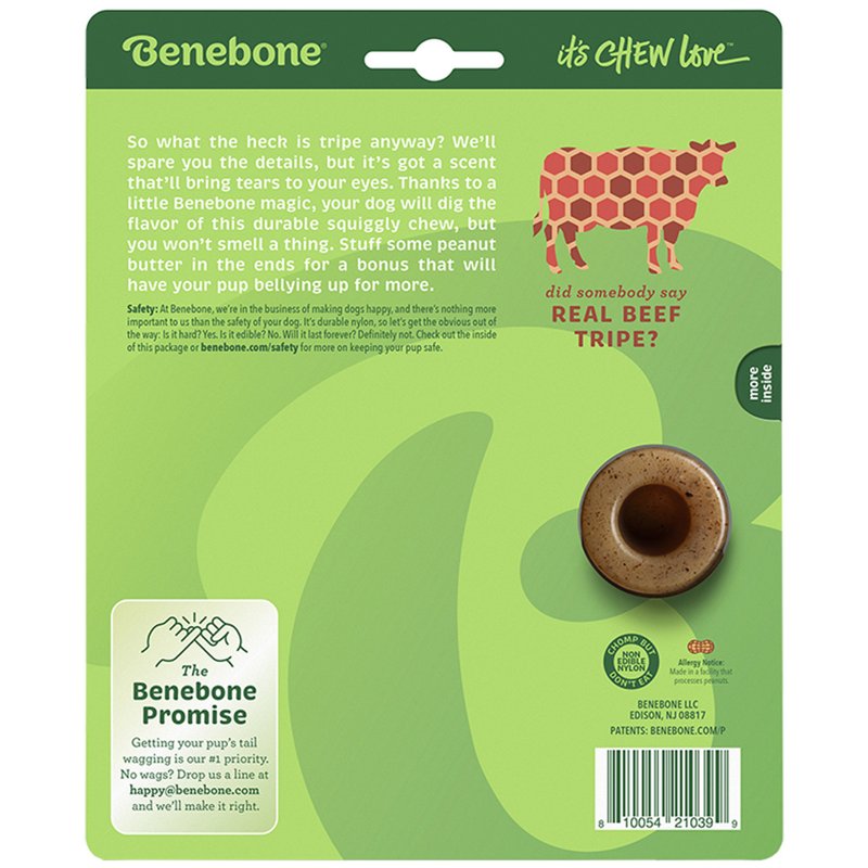 Dogs love to chew, especially on stuff that’s the real deal - because we know they can smell a fake a mile away. The Tripe Bone is fun to handle, has great flavor, and stands up to heavy chewing.About BeneboneAt Benebone, we started with the premise that dogs experience scent and flavor in a way we can’t even grasp. So, we ditched the neon colors and loud squeaks. Inspired by a dog’s powerful sense of smell, we developed a long-lasting durable chew that’s jam-packed with real tripe flavor. Once your dog takes a bite of our USA-made chews, he’ll be hooked.We’re Obsessed with Safety TooWonder if Benebone is right for your dog? Here’s what you need to know. Since it’s hard, it’s important that your pup has strong teeth. If you’re unsure, check with your vet. Nobody likes an unexpected trip to the dentist. Keep an eye out for wear and tear. Within a month or so, we find that most dogs chew Benebone into submission. See the wear page on our website for helpful photos to determine when to replace yours. Keep away from households with peanut or other allergies.What’s Inside?Nothing but Nylon and Real Beef Tripe for Tantalizing Flavor