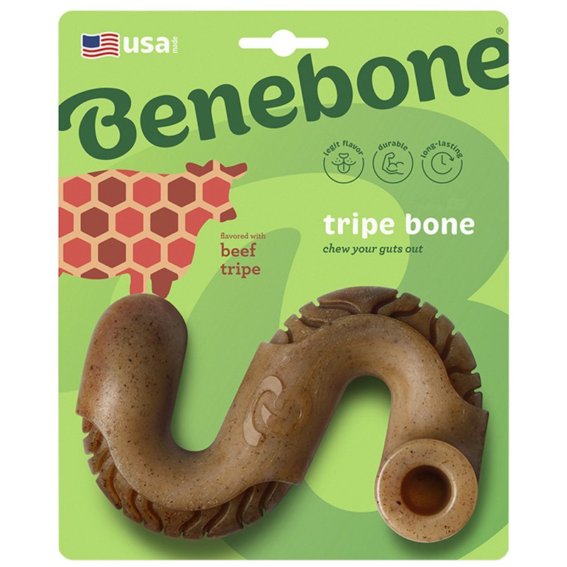 Dogs love to chew, especially on stuff that’s the real deal - because we know they can smell a fake a mile away. The Tripe Bone is fun to handle, has great flavor, and stands up to heavy chewing.About BeneboneAt Benebone, we started with the premise that dogs experience scent and flavor in a way we can’t even grasp. So, we ditched the neon colors and loud squeaks. Inspired by a dog’s powerful sense of smell, we developed a long-lasting durable chew that’s jam-packed with real tripe flavor. Once your dog takes a bite of our USA-made chews, he’ll be hooked.We’re Obsessed with Safety TooWonder if Benebone is right for your dog? Here’s what you need to know. Since it’s hard, it’s important that your pup has strong teeth. If you’re unsure, check with your vet. Nobody likes an unexpected trip to the dentist. Keep an eye out for wear and tear. Within a month or so, we find that most dogs chew Benebone into submission. See the wear page on our website for helpful photos to determine when to replace yours. Keep away from households with peanut or other allergies.What’s Inside?Nothing but Nylon and Real Beef Tripe for Tantalizing Flavor