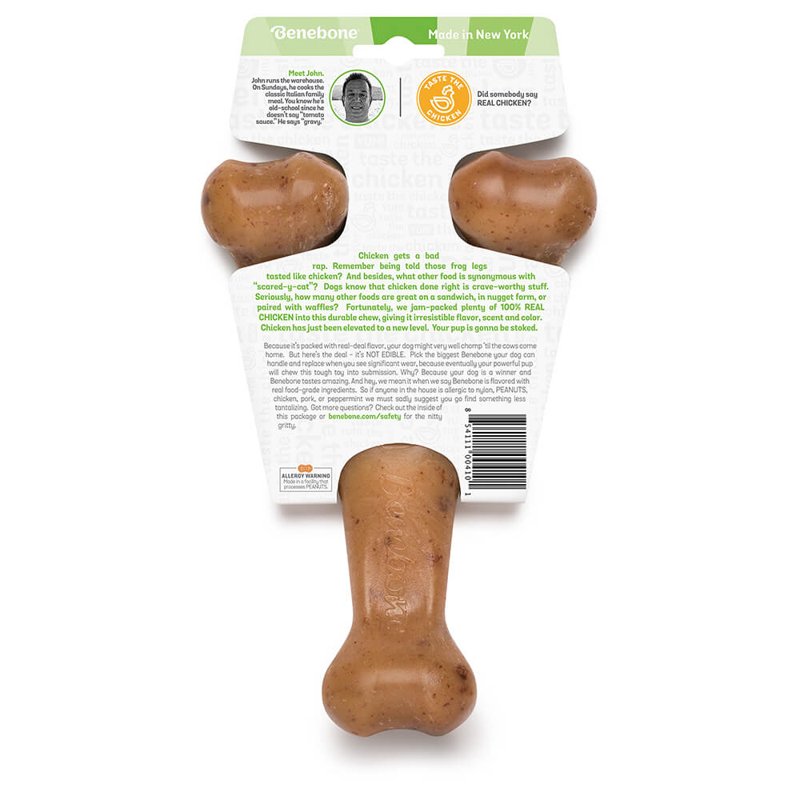 The Benebone WishboneDogs love to chew, especially on stuff that tastes like real chicken. The Wishbone is easy to handle, tastes awesome, and stands up to heavy chewing.About BeneboneAt Benebone, we started with the premise that dogs experience scent and flavor in a way we can’t even grasp. So we ditched the neon colors and loud squeaks. Inspired by a dog’s powerful sense of smell, we developed a long-lasting durable chew that’s jam-packed with real chicken. Once your dog takes a bite of our USA-made chews, he’ll be hooked.We’re Obsessed with Safety TooWonder if Benebone is right for your dog? Here’s what you need to know. Since it’s hard, it’s important that your pup has strong teeth. If you’re unsure, check with your vet. Nobody likes an unexpected trip to the dentist. Keep an eye out for wear and tear. Within a month or so, we find that most dogs chew Benebone into submission. See the wear page on our website for helpful photos to determine when to replace yours. Keep away from households with peanut or other allergies.What’s Inside?Nothing but Nylon and Real Chicken for Tantalizing Flavor