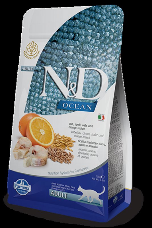 N&D Cod, spelt, oats and orange recipe is formulated to meet the nutritional levels established by the AAFCO Cat Food Nutrient Profiles for maintenance. ingredients cod, dehydrated cod, herring oil, whole spelt, whole oats, dried beet pulp, pea fiber, dried carrot, suncured alfalfa meal, inulin, fructooligosaccharide, yeast extract, dried sweet orange, dried apple, dried pomegranate, dried spinach, psyllium seed husk, dried blueberry, salt, brewers dried yeast, turmeric, vitamin A supplement, vitamin D3 supplement, vitamin E supplement, ascorbic acid, niacin, calcium pantothenate, riboflavin, pyridoxine hydrochloride, thiamine mononitrate, biotin, folic acid, vitamin B12 supplement, choline chloride, beta-carotene, zinc methionine hydroxy analogue chelate, manganese methionine hydroxy analogue chelate, ferrous glycine, copper methionine hydroxy analogue chelate, DL-Methionine, taurine, aloe vera gel concentrate, green tea extract, rosemary extract, mixed tocopherols (a preservative). ingredients and nutrition Supplemental information Nutritional additives: Vitamin A 18000IU; Vitamin D3 1200IU; Vitamin E 600mg; Vitamin C 300mg; Niacin 150mg; pantotenic acid 50mg; Vitamin B2 20mg; Vitamin B6 8.1mg; Vitamin B1 10mg; Vitamin H 1.5mg; folic acid 1.5mg; Vitamin B12 0.1mg; choline chloride 2500mg; Beta-carotene 1.5mg; zinc chelate of the analogous methionine hydroxylase 910mg; manganese chelate of the analogous methionine hydroxylase 380mg; ferrous chelate of glycine hydrate 250mg; copper chelate of the analogous methionine hydroxylase 88mg; DL-methionine 5000mg; Taurine 4000mg; L-Carnitine 300mg. Organoleptic additives: aloe vera extract 1000mg; green tea extract 100mg; rosemary extract. Antioxidants: tocopherol-rich extracts of natural origin. guaranteed analysis Crude Protein (min): 36.00%; Crude Fat (min): 20.00%; Crude Fiber (max): 1.90%; Moisture (max): 8.00%; Ash (max): 8.00%; Docosahexaenoic Acid (DHA) (min): 1.0%; Eicosapentaenoic Acid (EPA) (min): 0.80%; Calcium (min): 1.00%; Phosphorus (min): 0.90%; Magnesium (min): 0.08%; Taurine (min): 0.40%; Omega-6 Fatty Acids* (min): 1.80%; Omega-3 Fatty Acids* (min): 2.50%. *Not recognized as an essential nutrient by the AAFCO Cat Food Nutrient Profiles. energy value EM Kcal/lb 1891 - Mj/lb 7.91 388 Kcal/cup KIBBLE COLOR DISCLAIMER Sometimes, the external appearance of the food may change in the different production batches since we only use natural ingredients, sometimes there may be variability in their color that is reflected also in the kibbles. Same animal species could have different meat colors, darker or lighter, and this is reflected in the kibbles color. Farmina does not use any artificial color to uniform different batches. Therefore, the occurrence of different shades of color in the kibbles is normal and does not affect the quality of the food, or its nutritional characteristics. For any further clarification don't hesitate and get in touch with your Genius Consultant. KIBBLE SIZE All the kibbles have a range for size, to ensure a correct fragmentation of the food. Although it is a rare occurrence, sometimes minimal variations inside the same bag are possible. As far as the kibbles are within the control range, everything is normal and as it should be. If you notice some kibbles out of the below ranges, please get in touch with your Genius Consultant because you could be eligible for the 100% Guarantee policy. KIBBLES SIZES: STARTER: Diameter 5-7 mm - Thickness: 4-5 mm PUPPY MINI: Diameter 8-10 mm - Thickness 4-6 mm PUPPY MEDIUM-MAXI: Diameter 12-14 mm - Thickness 5-7 mm ADULT MINI: Diameter 8-10 mm - Thickness 4-6 mm ADULT MEDIUM-MAXI: Diameter 14-17 mm - Thickness 8-10 mm ADULT MAXI-GIANT: Diameter 19-21 mm - Thickness 11-13 mm QUINOA MINI: Diameter 8-10 mm - Thickness 4-6 mm QUINOA MEDIUM-MAXI & UNIVERSAL KIBBLE: Diameter 12-14 mm - Thickness 5-7 mm KITTEN: Diameter 5-7 mm - Thickness: 4-5 mm FELINE ADULT: Diameter 8-10 mm - Thickness 3.5-5.5 mm Bag 3.3lb 11lb