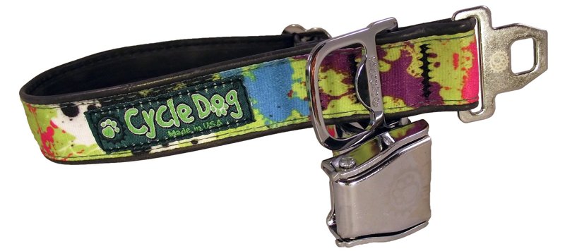 Cycle Dog Bottle Opener Recycled Dog Collar with Seatbelt Metal Buckle, Green, Base Paint Splatter, Medium