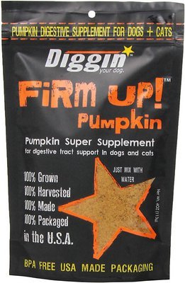 FiRM UP for dogs and cats affordably supports and maintains healthy digestion and stool consistency in pets. FiRM UP may be used by pet owners when transitioning foods, nervous travel, and as a daily digestive supplement to maintain regularity. The two ingredients are Pumpkin and Apple Pectin which are 100 percent grown, harvested, made, and hand-packaged in the USA. These two ingredients are a supplemental source of vitamin C and E, potassium, magnesium, fiber, and alpha and beta carotenes. Our product is shelf stable. It can be fed wet or dry and mixed with food.HOW DOES FIRM UP SUPPORT CONSISTENT POOPS?Occasional diarrhea due to dietary indiscretion = LACK OF WATER absorption of the colon and lower bowel. The fiber factor in FiRM UP! may aid in forming solid stool by slowing down digestion and the passage of waste, giving the body time to naturally absorb more water.Occasional constipation due to dietary indiscretion = TOO MUCH WATER reabsorbed into the body due to the slow passage of waste matter through the colon. The result is dry and difficult to pass stools. The fiber factor in FiRM UP! may help in keeping water from being reabsorbed by the colon; giving the colon the proper fluids it needs for hard to pass stool.