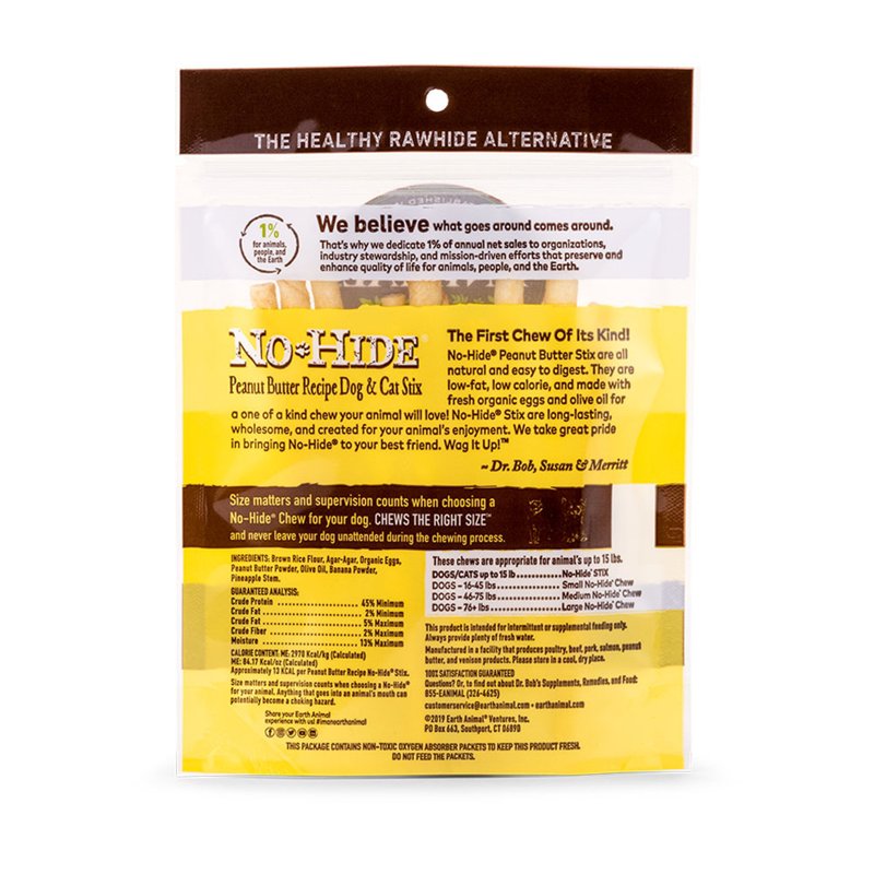 Our No-Hide Wholesome Chews deliver healthy, deliciously long-lasting chewable bliss for dogs (and cats!) of all shapes and sizes. Our No-Hide Wholesome Chews are the healthy, hand-rolled alternative to rawhide! They are carefully hand-rolled, uniquely cooked then air-dried making them easily digestible and nutritious. No-Hides are 100% free of rawhide, chemicals, additives, bleaches, and formaldehydes. Our No-Hide Wholesome Chews are proudly made in the USA. All No-Hides are packaged by weight, but on average; the Small is approximately 4â€, Medium approximately 7â€, and Large approximately 11†long. Earth Animal dedicates 1% of net sales to efforts that preserve and enhance quality of life for animals, people, and the Earth.