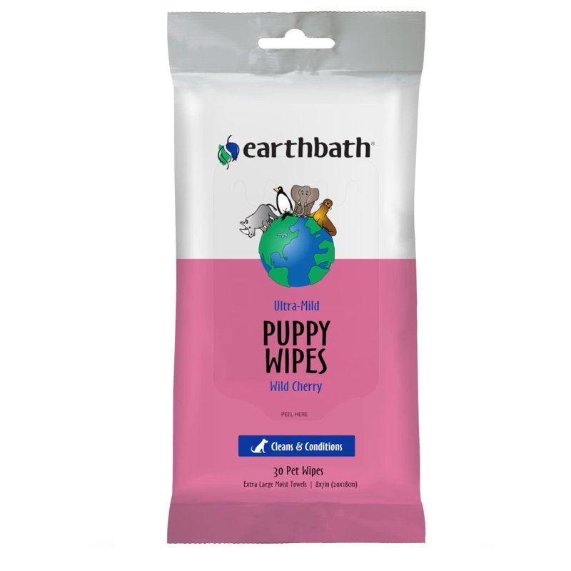 earthbath Ultra-Mild Wild Cherry Puppy Grooming Wipes - Softly Wipe Away Dirt and Odor, Moisturizes, Aloe Vera, Vitamin E - Handily Clean Your Puppies' Dirty Paws & Undercoat - 30 Count