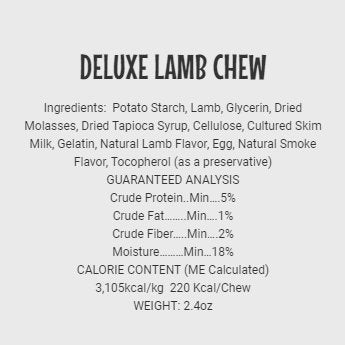 Potato Starch, Lamb, Glycerin, Dried Molasses, Dried Tapioca Syrup, Cellulose, Cultured Skim Milk, Gelatin, Natural Lamb Flavor, Egg, Natural Smoke Flavor, Tocopherol (as a preservative)Potato starch, lamb, glycerin, dried molasses, dried tapioca syrup, cellulose, cultured skim milk, gelatin, natural lamb flavor, egg, natural smoke flavor, tocopherol (as a preservative)