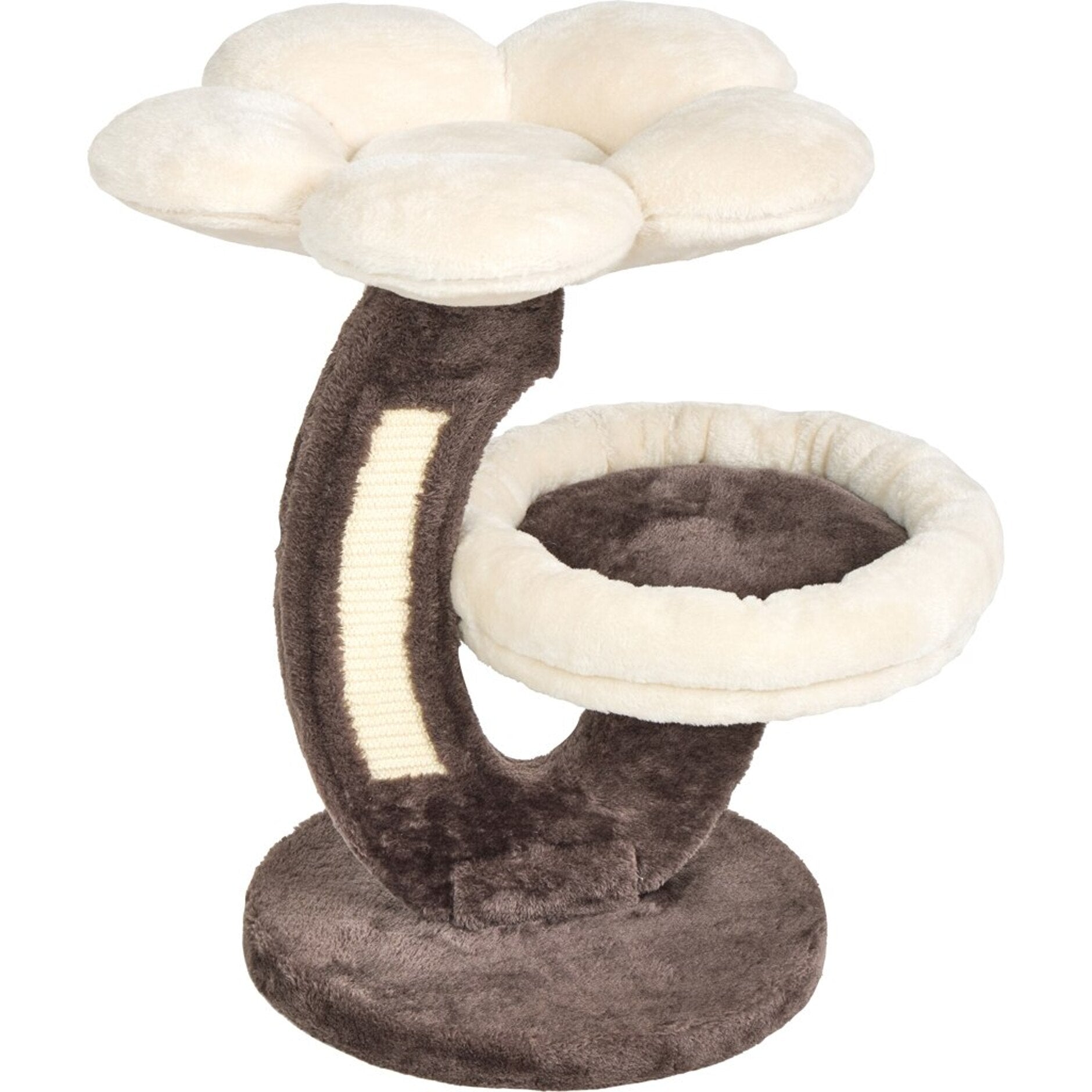 - Multi-tier design features a plush faux fur bolstered bed and elevated flower bed for lots of lazy lounging.