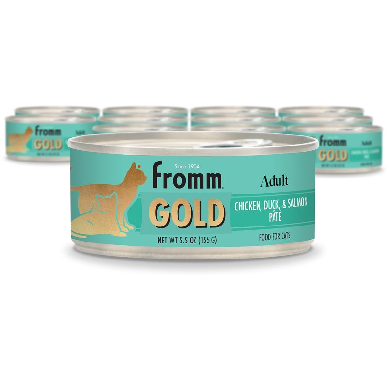 About Adult Gold Chicken, Duck, & Salmon Pâté: This premium wet cat food is for normally active adult cats. Contains chicken, duck, and salmon. A higher moisture content can help your cat with hydration and feeling full without increasing their calorie intake. Enhanced with omega-rich ingredients to support healthy skin and a shiny coat. About Fromm Family Foods: We're a fifth-generation family-owned-and-operated pet food company based in Wisconsin. We use high-quality meat and fish, Wisconsin cheese, pre and probiotics, farm fresh produce, and whole grains from vetted suppliers. Ingredients: