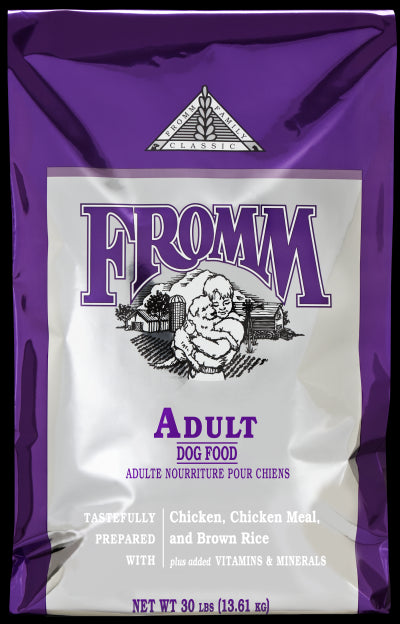 About Fromm Classic Adult: This premium dry dog food is for normally active adult dogs. It's tastefully prepared with chicken, brown rice, and eggs. About Fromm Family Foods: We're a fifth-generation family-owned-and-operated pet food company based in Wisconsin. We use high-quality meat and fish, Wisconsin cheese, pre and probiotics, farm fresh produce, and whole grains from vetted suppliers. Ingredients: Chicken, chicken meal, brown rice, pearled barley, oatmeal, white rice, chicken fat (preserved with mixed tocopherols), beet pulp, menhaden fish meal, dried egg product, cheese, flaxseed, brewers dried yeast, chicken liver, potassium chloride, salt, Vitamins [choline chloride, Vitamin E supplement, ascorbic acid, calcium carbonate, riboflavin supplement, niacin supplement, calcium pantothenate, Vitamin A supplement, Vitamin D3 supplement, pyridoxine hydrochloride, biotin, Vitamin B12 supplement, thiamine mononitrate, folic acid], Minerals [zinc sulfate, manganese sulfate, ferrous sulfate, magnesium sulfate, zinc proteinate, ferrous proteinate, manganese proteinate, copper sulfate, magnesium proteinate, copper proteinate, calcium iodate], calcium sulfate, sorbic acid (preservative), chicory root extract, yucca schidigera extract, sodium selenite, dl-methionine, l-tryptophan, taurine, dried Pediococcus acidilactici fermentation product, dried Lactobacillus acidophilus fermentation product, dried Lactobacillus plantarum fermentation product, dried Bifidobacterium longum fermentation product.