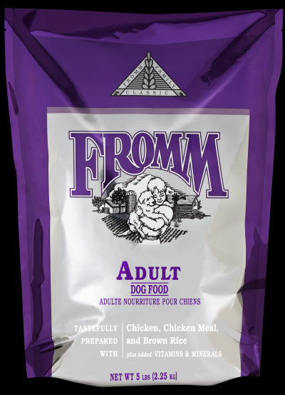 About Fromm Classic Adult: This premium dry dog food is for normally active adult dogs. It's tastefully prepared with chicken, brown rice, and eggs. About Fromm Family Foods: We're a fifth-generation family-owned-and-operated pet food company based in Wisconsin. We use high-quality meat and fish, Wisconsin cheese, pre and probiotics, farm fresh produce, and whole grains from vetted suppliers. Ingredients: Chicken, chicken meal, brown rice, pearled barley, oatmeal, white rice, chicken fat (preserved with mixed tocopherols), beet pulp, menhaden fish meal, dried egg product, cheese, flaxseed, brewers dried yeast, chicken liver, potassium chloride, salt, Vitamins [choline chloride, Vitamin E supplement, ascorbic acid, calcium carbonate, riboflavin supplement, niacin supplement, calcium pantothenate, Vitamin A supplement, Vitamin D3 supplement, pyridoxine hydrochloride, biotin, Vitamin B12 supplement, thiamine mononitrate, folic acid], Minerals [zinc sulfate, manganese sulfate, ferrous sulfate, magnesium sulfate, zinc proteinate, ferrous proteinate, manganese proteinate, copper sulfate, magnesium proteinate, copper proteinate, calcium iodate], calcium sulfate, sorbic acid (preservative), chicory root extract, yucca schidigera extract, sodium selenite, dl-methionine, l-tryptophan, taurine, dried Pediococcus acidilactici fermentation product, dried Lactobacillus acidophilus fermentation product, dried Lactobacillus plantarum fermentation product, dried Bifidobacterium longum fermentation product.