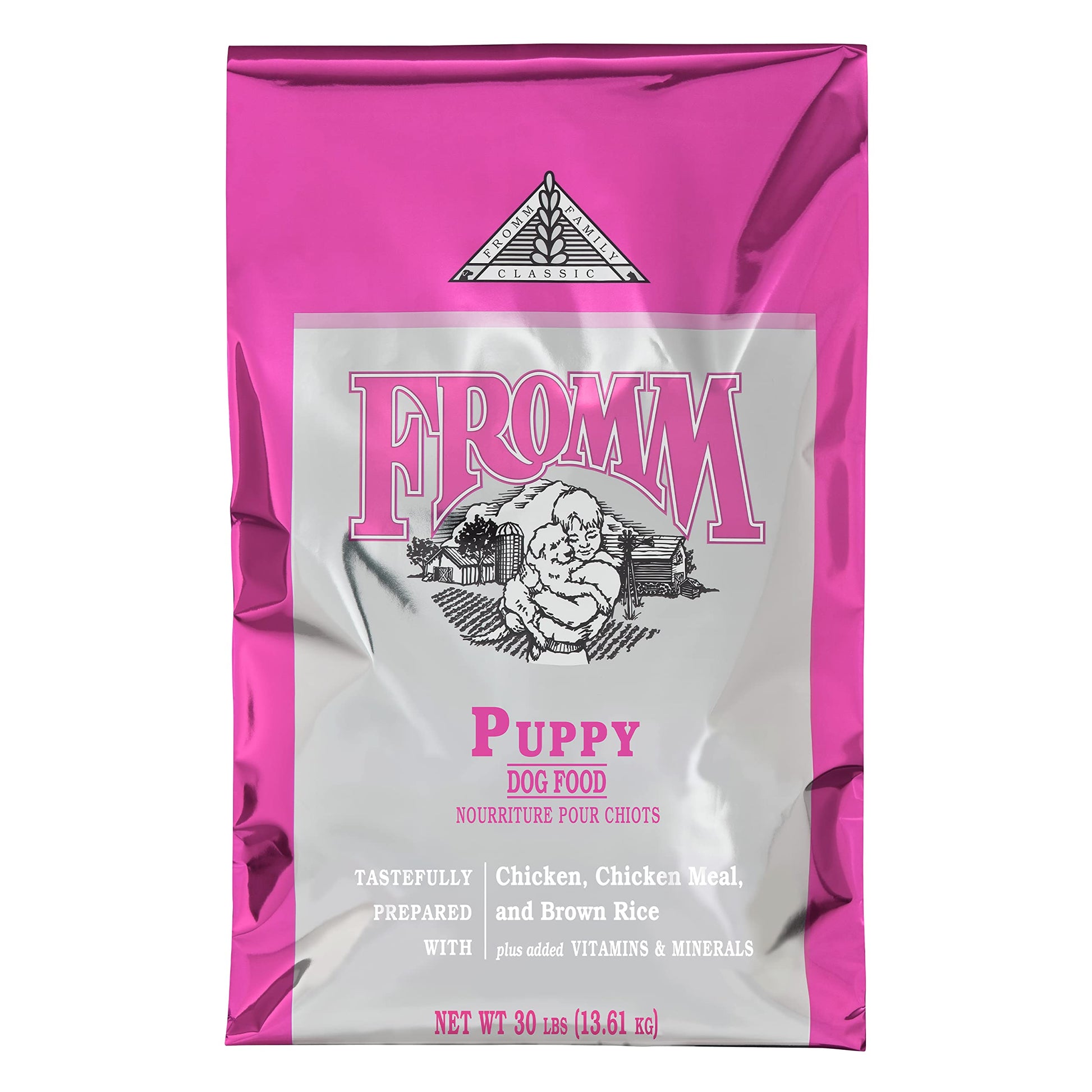 About Fromm Classic Puppy: This premium dry dog food is for growing puppies. It's tastefully prepared with chicken, brown rice, and eggs. About Fromm Family Foods: We're a fifth-generation family-owned-and-operated pet food company based in Wisconsin. We use high-quality meat and fish, Wisconsin cheese, pre and probiotics, farm fresh produce, and whole grains from vetted suppliers. Ingredients: Chicken, chicken meal, pearled barley, oatmeal, menhaden fish meal, brown rice, white rice, beet pulp, chicken fat (preserved with mixed tocopherols), dried egg product, salmon oil (preserved with mixed tocopherols), flaxseed, cheese, brewers dried yeast, chicken liver, monocalcium phosphate, salt, potassium chloride, Vitamins [choline chloride, Vitamin E supplement, ascorbic acid, calcium carbonate, riboflavin supplement, niacin supplement, calcium pantothenate, Vitamin A supplement, Vitamin D3 supplement, pyridoxine hydrochloride, biotin, Vitamin B12 supplement, thiamine mononitrate, folic acid], dl-methionine, chicory root extract, Minerals [zinc sulfate, manganese sulfate, ferrous sulfate, magnesium sulfate, zinc proteinate, ferrous proteinate, manganese proteinate, copper sulfate, magnesium proteinate, copper proteinate, calcium iodate], chicken cartilage, yucca schidigera extract, sodium selenite, sorbic acid (preservative), l-tryptophan, taurine, dried Pediococcus acidilactici fermentation product, dried Lactobacillus acidophilus fermentation product, dried Lactobacillus plantarum fermentation product, dried Bifidobacterium longum fermentation product.
