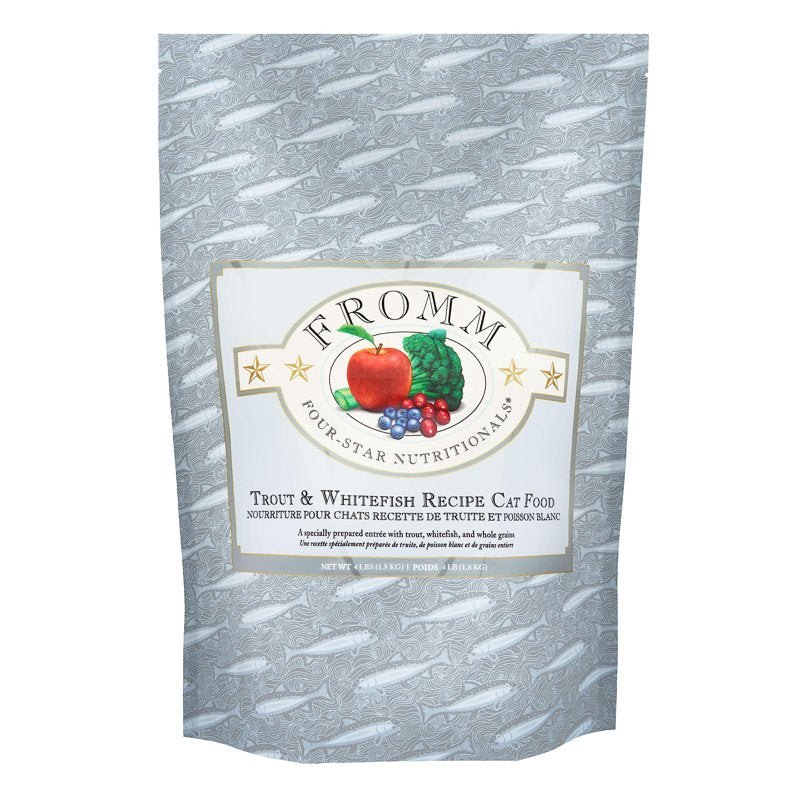 About Fromm Four-Star Nutritionals Trout & Whitefish Recipe: This premium dry cat food is a specialty entrée with strout, whitefish, and whole grains. You may feed our Four-Star recipes interchangeably so mealtime is unique every day of the week. About Fromm Family Foods: We're a fifth-generation family-owned-and-operated pet food company based in Wisconsin. We use high-quality meat and fish, Wisconsin cheese, pre and probiotics, farm fresh produce, and whole grains from vetted suppliers. Ingredients: Trout, whitefish, menhaden fish meal, dried egg product, salmon meal, whole barley, whole oats, brown rice, natural flavor, canola oil (preserved with mixed tocopherols), oatmeal, pearled barley, salmon oil (preserved with mixed tocopherols), dried tomato pomace, miscanthus grass, flaxseed, dl-methionine, broccoli, apples, Vitamins [choline chloride, potassium chloride, Vitamin E supplement, niacin supplement, ascorbic acid, calcium carbonate, pyridoxine hydrochloride, Vitamin A supplement, folic acid, calcium pantothenate, thiamine mononitrate, riboflavin supplement, Vitamin D3 supplement, biotin, Vitamin B12 supplement], chicory root extract, taurine, sorbic acid (preservative), Minerals [zinc sulfate, manganese sulfate, ferrous sulfate, magnesium sulfate, zinc proteinate, ferrous proteinate, manganese proteinate, copper sulfate, magnesium proteinate, copper proteinate, calcium iodate], salt, cranberries, yucca schidigera extract, sodium selenite, blueberries, dried Pediococcus acidilactici fermentation product, dried Lactobacillus acidophilus fermentation product, dried Lactobacillus plantarum fermentation product, dried Bifidobacterium longum fermentation product.