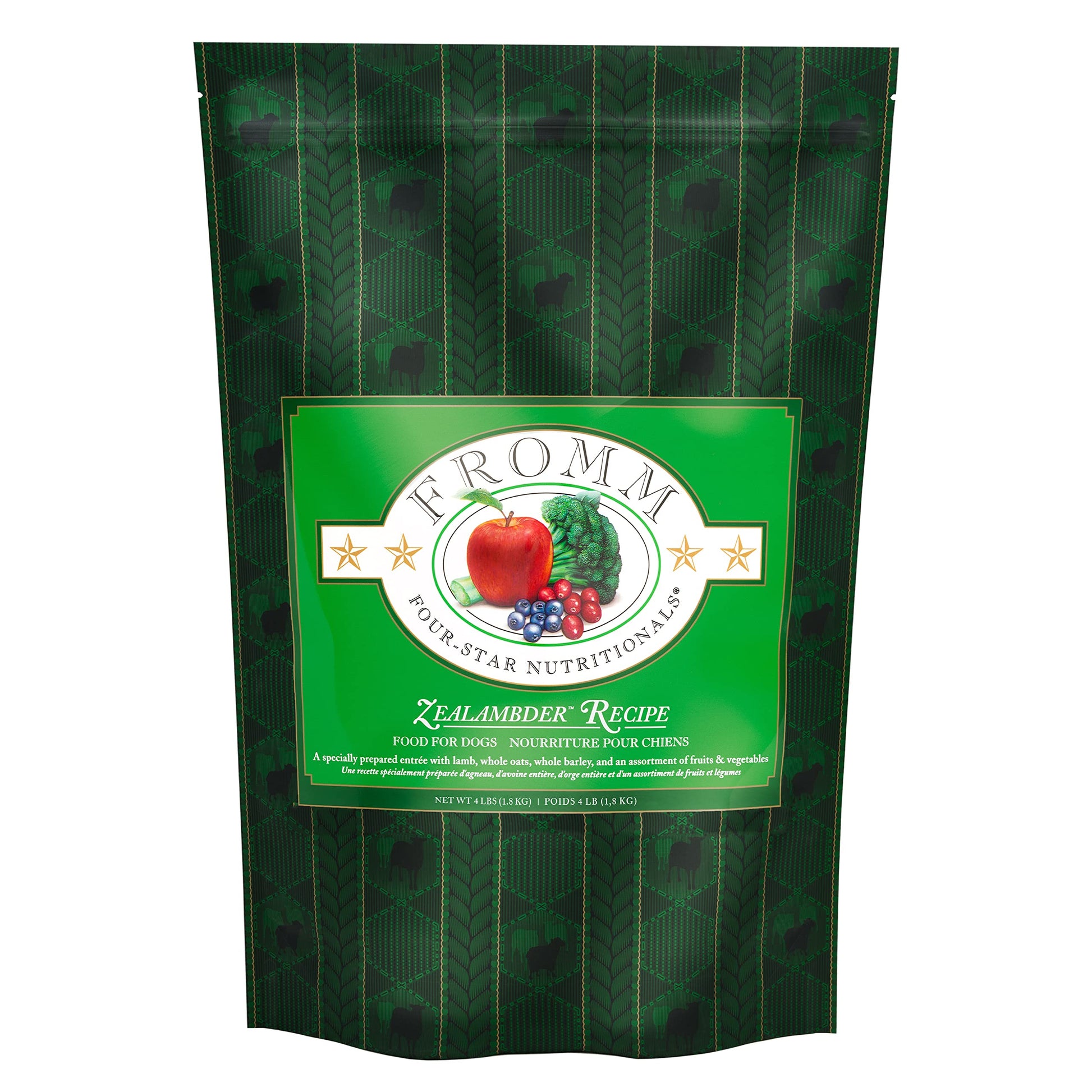 About Fromm Four-Star Nutritionals Zealambder Recipe: This premium dry dog food is a New Zealand-inspired entre, specially prepared with lamb, whole oats, whole barley, and an assortment of fruits & vegetables. You may feed our Four-Star recipes interchangeably so mealtime is unique every day of the week. About Fromm Family Foods: We're a fifth-generation family-owned-and-operated pet food company based in Wisconsin. We use high-quality meat and fish, Wisconsin cheese, pre and probiotics, farm fresh produce, and whole grains from vetted suppliers. Ingredients: Lamb, whole oats, whole barley, dried egg product, oatmeal, pearled barley, lamb meal, salmon meal, dried tomato pomace, lamb liver, pork liver, pork fat (preserved with mixed tocopherols), salmon oil (preserved with mixed tocopherols), venison, pumpkin, flaxseed, alfalfa meal, kiwifruit, apples, broccoli, carrots, alfalfa sprouts, potassium chloride, Vitamins [choline chloride, Vitamin E supplement, ascorbic acid, calcium carbonate, riboflavin supplement, niacin supplement, calcium pantothenate, Vitamin A supplement, Vitamin D3 supplement, pyridoxine hydrochloride, biotin, Vitamin B12 supplement, thiamine mononitrate, folic acid], chicory root extract, New Zealand green mussels, salt, Minerals [zinc sulfate, manganese sulfate, ferrous sulfate, magnesium sulfate, zinc proteinate, ferrous proteinate, manganese proteinate, copper sulfate, magnesium proteinate, copper proteinate, calcium iodate], taurine, cranberries, yucca schidigera extract, sodium selenite, sorbic acid (preservative), blueberries, dried Pediococcus acidilactici fermentation product, dried Lactobacillus acidophilus fermentation product, dried Lactobacillus plantarum fermentation product, dried Bifidobacterium longum fermentation product.