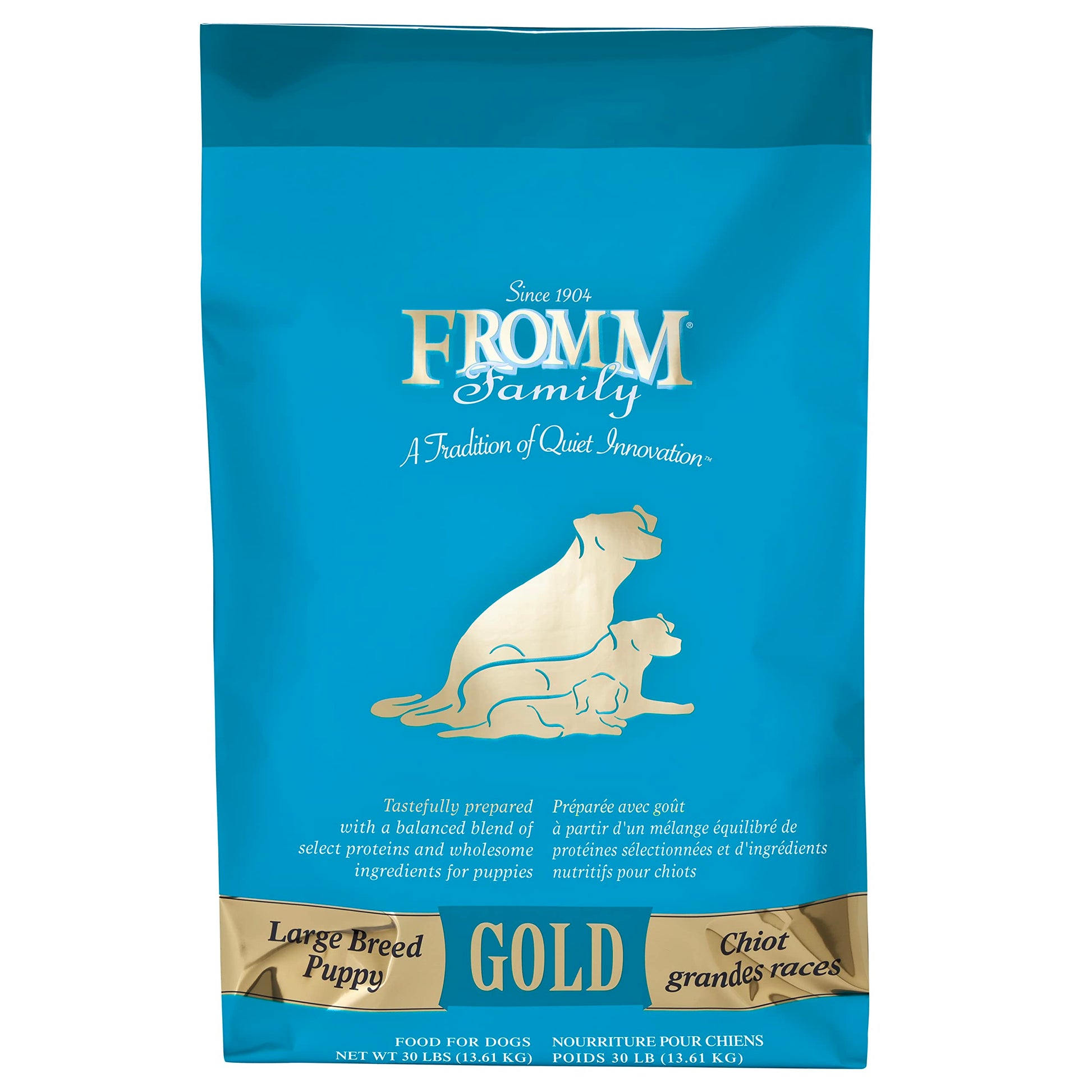About Fromm Large Breed Puppy Gold: This is a premium dry dog food for puppies of breeds with adult weights greater than 50 pounds. Tastefully prepared with select proteins and wholesome ingredients. Enhanced with probiotics to aid digestion and salmon oil for a healthy coat. About Fromm Family Foods: We're a fifth-generation family-owned-and-operated pet food company based in Wisconsin. We use high-quality meat and fish, Wisconsin cheese, pre and probiotics, farm fresh produce, and whole grains from vetted suppliers. Ingredients: Chicken, chicken meal, chicken broth, oatmeal, pearled barley, brown rice, potatoes, menhaden fish meal, dried tomato pomace, chicken fat (preserved with mixed tocopherols), dried egg product, chicken liver, whole oats, flaxseed, brewers dried yeast, whole barley, cheese, salmon oil (preserved with mixed tocopherols), duck, lamb, carrots, sweet potatoes, celery, alfalfa meal, monosodium phosphate, salt, potassium chloride, Vitamins [choline chloride, Vitamin E supplement, ascorbic acid, calcium carbonate, riboflavin supplement, niacin supplement, calcium pantothenate, Vitamin A supplement, Vitamin D3 supplement, pyridoxine hydrochloride, biotin, Vitamin B12 supplement, thiamine mononitrate, folic acid], dl-methionine, chicory root extract, taurine, calcium sulfate, chicken cartilage, Minerals [zinc sulfate, manganese sulfate, ferrous sulfate, magnesium sulfate, zinc proteinate, ferrous proteinate, manganese proteinate, copper sulfate, magnesium proteinate, copper proteinate, calcium iodate], sorbic acid (preservative), yucca schidigera extract, l-tryptophan, sodium selenite, dried Pediococcus acidilactici fermentation product, dried Lactobacillus acidophilus fermentation product, dried Lactobacillus plantarum fermentation product, dried Bifidobacterium longum fermentation product.