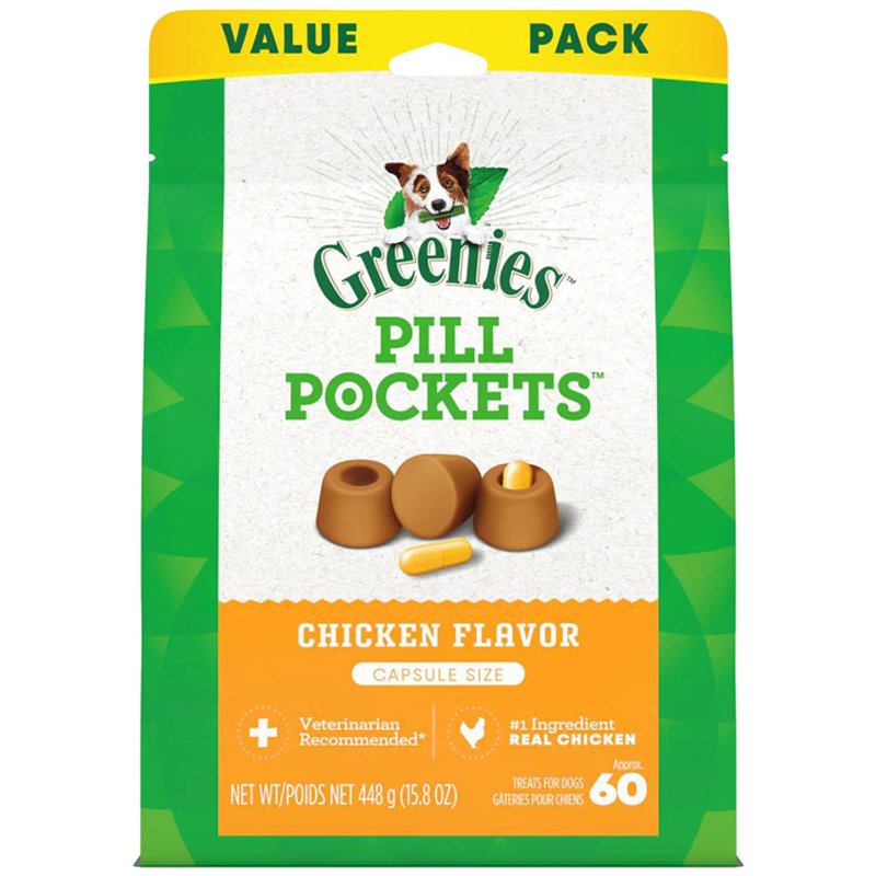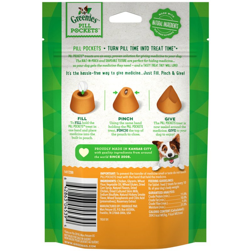 PILL POCKETS TURN PILL TIME INTO TREAT TIME. GREENIES Pill Pockets Treats for Dogs make it easy to give your dog medicine, with a tasty chicken flavor they’re sure to love. Why hide your pet’s medicine in human foods like peanut butter or cheese when you can give them a healthy all natural dog treat, made with natural, real ingredients plus trace nutrients instead? Designed by veterinarians, GREENIES Pill Pockets Dog Treats mask the smell and taste of any medicine, taking the stress (and mess) out of giving your canine companion medicine. Whether for large breed or small dogs, these smaller-sized Pill Pockets for capsules make taking medicine a positive experience for your dog. And they’re easy to give: Simply drop a capsule into the Pill Pockets pouch, pinch the top half closed, give it to your pup, and poof: Watch their medicine disappear. GREENIES Pill Pockets are the ingenious way to give your dog their meds-and they’ll never know the difference. * Data on file at Mars Petcare US, Inc. 2018