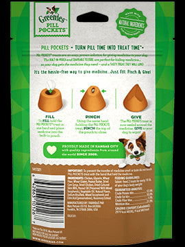 PILL POCKETS TURN PILL TIME INTO TREAT TIME. GREENIES Pill Pockets Treats for Dogs make it easy to give your dog medicine, with a tasty real peanut butter flavor they’re sure to love. Why hide your pet’s medicine in human foods like peanut butter or cheese when you can give them a healthy all natural dog treat, made with natural, real ingredients plus trace nutrients instead? Designed by veterinarians, GREENIES Pill Pockets Dog Treats mask the smell and taste of any medicine, taking the stress (and mess) out of giving your canine companion medicine. Whether for large breed or small dogs, these smaller-sized Pill Pockets for capsules make taking medicine a positive experience for your dog. And they’re easy to give: Simply drop a capsule into the Pill Pockets pouch, pinch the top half closed, give it to your pup, and poof: Watch their medicine disappear. GREENIES Pill Pockets are the ingenious way to give your dog their meds-and they’ll never know the difference. * Data on file at Mars Petcare US, Inc. 2018