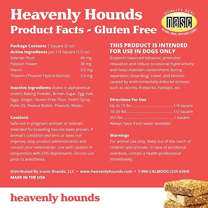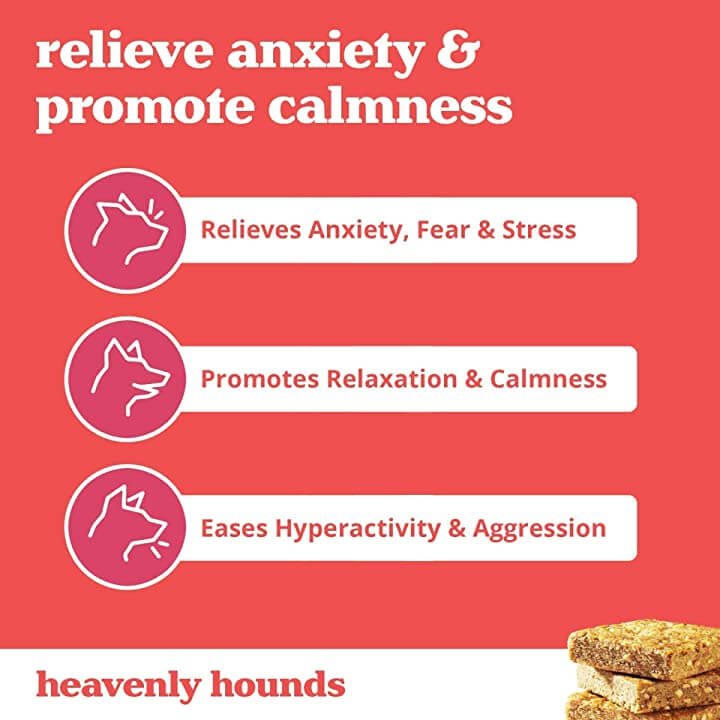 Heavenly Hounds uses wholesome ingredients with added vitamins and minerals. This anxiety relief for dogs does not contain hemp to help naturally support relief of dog anxiety. This tasty dog snack supports anxiety relief for dogs with a fear of storms, fireworks, pet owner separation, boarding, grooming and travel. These calming treats also relieve dog stress and anxiety, hyperactivity, restlessness and car sickness in dogs.