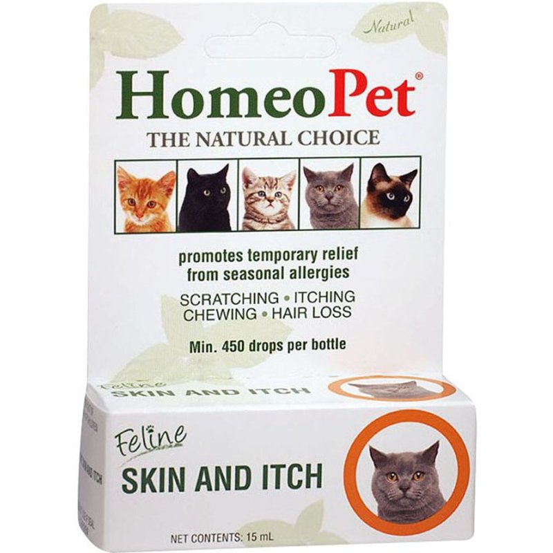 HomeoPet Feline Skin & Itch is a homeopathic remedy that provides temporary relief from constant scratching, itching, gnawing, hair loss and bald belly caused by allergies. It helps to detoxify the skin from the inside, leaving the coat thick and shiny. Best of all, it's safe, gentle and 100% natural.