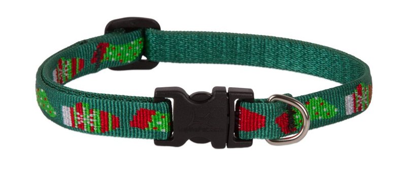 Lupine’s 1/2†wide collars are suitable for puppies and small dogs up to about 20 lbs. Made from jacquard woven with strong bar-tack stitching, welded D-ring and a custom designed side-release buckle. Bright Christmas design in two size ranges: adjustable 8â€-12†and 10â€- 16â€. Matching 6-foot leash available. To determine collar size, measure snugly around the middle of the dog’s neck, then add an extra 5% for a comfortable fit. Lupine products are not recommended for tie-out. Machine wash, warm water, mild soap (no bleach or bleach alternative). Air dry.