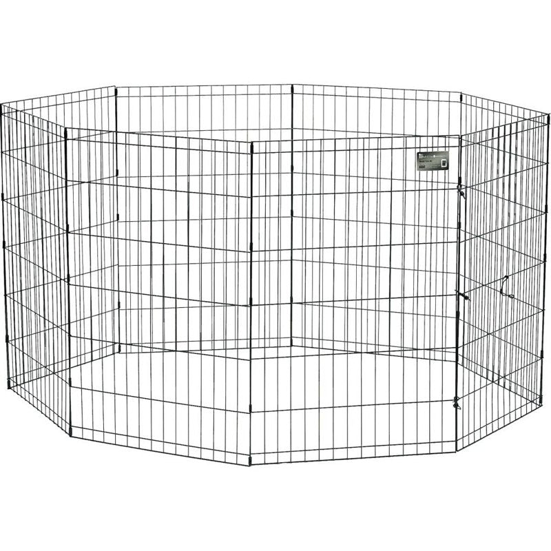 The metal Exercise Pen / Pet Playpen by MidWest Homes for Pets provides a great enclosure to keep your pet safe and secure while indoors or outside. These Exercise Pens / Pet Playpens are made of durable metal wire that features a black E-coat finish for long lasting protection against rust and the elements. The black Exercise Pen / Pet Playpen by MidWest Homes for Pets consists of 8 - 24" wide panels and is available in 5 different heights. When fully expanded, the Exercise Pen / Pet Playpen provides your pet with 16 square feet of enclosed living area. Each durable metal Exercise Pen / Pet Playpen is simple to set up (no tools required) and includes 8 ground stakes for secure set-up while being used outdoors and 4 thumb-snaps for easy assembly. These versatile Exercise Pens / Pet Playpens can be used for a variety of pets and fold flat for convenient storage when not in use. Make sure to check out the additional Sunscreen or Wire Mesh Top for the Exercise Pen / Pet Playpen if you want to add additional security or shade to the pen when using it outdoors. As always, MidWest Homes for Pets stands behind the quality of our products with a 1 year Manufacturer's Warranty.