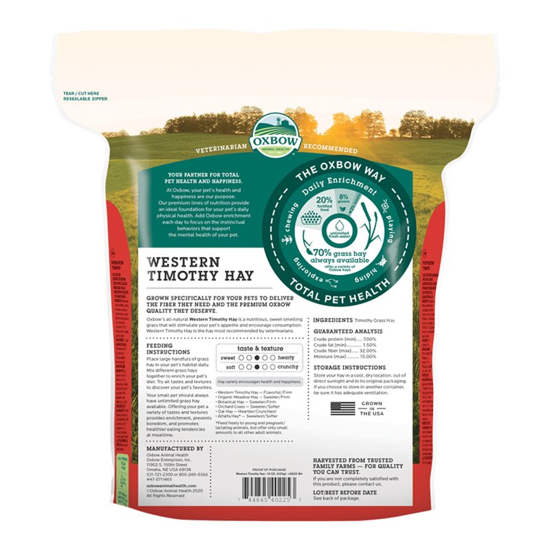 At Oxbow Animal Health, our purpose is to help people and pets live happy, healthy lives. For more than 30 years, we’ve partnered with leading veterinarians and nutritionists to develop nutrition and care products that meet the specific species and life stage needs of rabbits, guinea pigs, chinchillas, hamsters, gerbils, rats, and mice. From farm fresh hays and nourishing fortified foods to wholesome treats, beneficial supplements, enrichment and care, Oxbow products are used and recommended by leading veterinary professionals and passionate pet parents worldwide. Oxbow’s all-natural Western Timothy Hay is a nutritious, sweet-smelling grass that will stimulate the appetite of your rabbit, guinea pig, chinchilla, or other small pet. Western Timothy is the #1 vet-recommended hay for small herbivores. FEEDING INSTRUCTIONS: Place large handfuls of grass hay in your pet’s habitat daily. Mix different grass hays together to enrich your pet’s diet. Try all tastes and textures to discover your pet’s favorites.