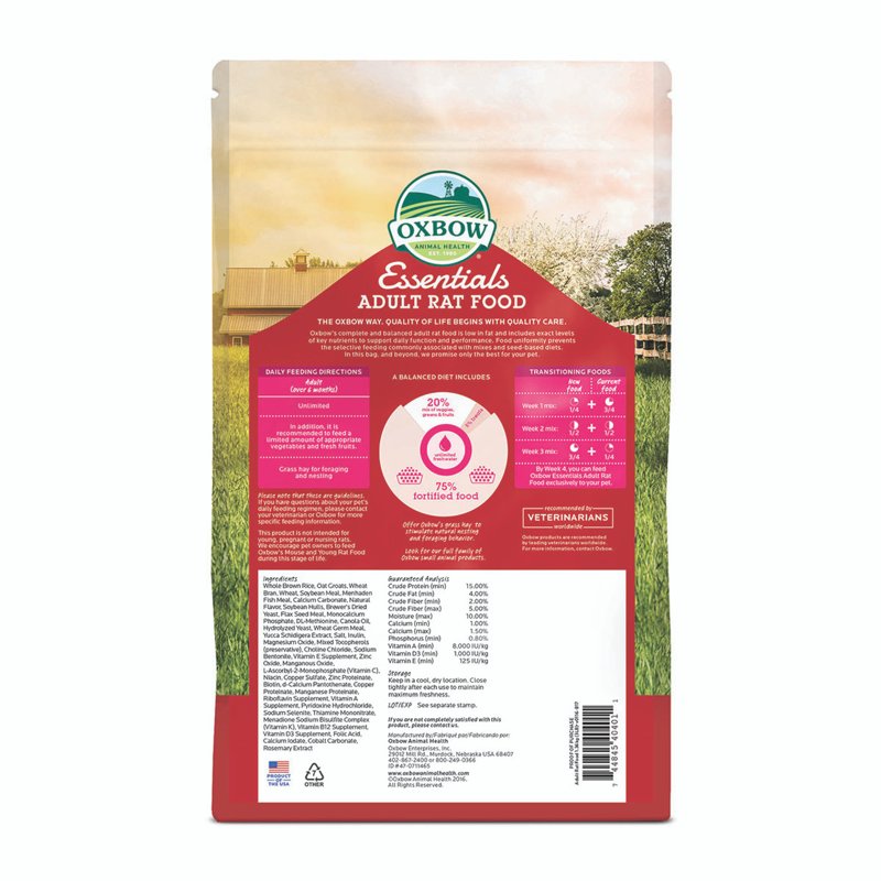 At Oxbow Animal Health, our purpose is to help people and pets live happy, healthy lives. For more than 30 years, we’ve partnered with leading veterinarians and nutritionists to develop nutrition and care products that meet the specific species and life stage needs of rabbits, guinea pigs, chinchillas, hamsters, gerbils, rats, and mice. From farm fresh hays and nourishing fortified foods to wholesome treats, beneficial supplements, enrichment and care, Oxbow products are used and recommended by leading veterinary professionals and passionate pet parents worldwide. Oxbow’s Essentials - Adult Rat Food is formulated to meet the specific nutritional needs of adult rats. This complete and balanced rat food is low in fat and includes exact levels of key nutrients to support daily function and performance. The uniformity of Essentials - Adult Rat Food prevents the selective feeding commonly associated with mixes and seed-based diets. FEEDING INSTRUCTIONS: Adult (over 6 months) unlimited In addition, it is recommended to feed a limited amount of appropriate vegetables and fresh fruits. Grass hay for foraging and nesting. Offer Oxbow’s grass hay to stimulate natural nesting and foraging behavior. Oxbow Essentials - Adult Rat Food is not intended for growing, gestating or lactating animals. Feed Oxbow Essentials - Young Rat Food to rats requiring a higher level of nutrition. Please note that these are guidelines.
