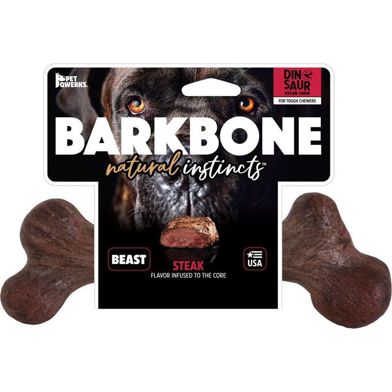 Pet Qwerks Dinosaur BarkBone - Nylon Dog Bone for Aggressive Chewers - Steak Flavor - 11"