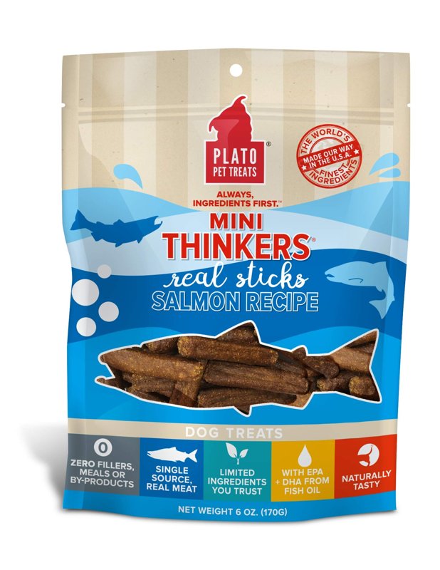 Mini Thinkers Salmon are small but hearty, meat-packed sticks with added EPA and DHA to support healthy brain function, are a natural source of Omega 3 & 6 fatty acids, and support skin and coat health. Made with real salmon as the 1st ingredient, these treats are made with limited ingredients, are naturally preserved and contain no artificial flavors, corn, wheat, or soy. Mini Thinkers offer chewing satisfaction in smaller portions and are size-appropriate for smaller dogs. And we take the extra time to air-dry them in batches in our USA facility instead of baking them in order to retain more of the ingredients’ inherent nutrients (but your dog will just think that they smell and taste amazing). It takes longer, but we think its worth it. Mini Thinkers also come in Chicken and Duck.