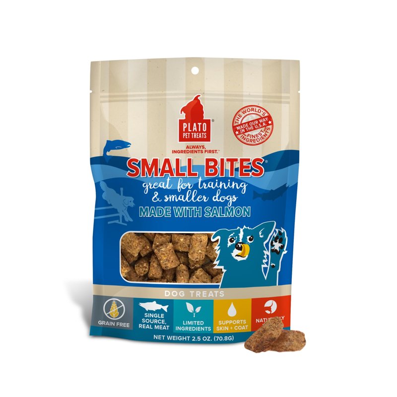 PLATO Small Bites Dog Treats, Natural Bite Sized Real Meat & Salmon Flavor, Grain Free & High in Protein, Air Dried Authentic Ingredients, 2 Calories Per Treat, Made in the USA, 2.5 Ounces