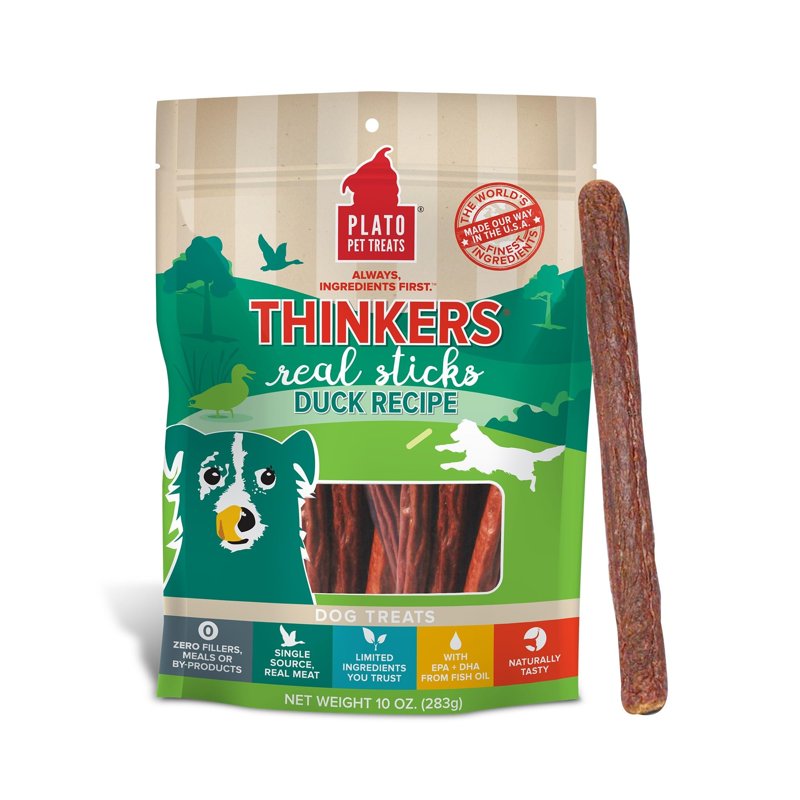 Thinkers Duck are hearty, meat-packed sticks with added EPA and DHA to support healthy brain function. Made with real duck as the 1st ingredient, these treats are made with limited ingredients, are naturally preserved, and contain no artificial flavors, corn, wheat, or soy. Because of their large size, Thinkers offer substantial chewing satisfaction or can be broken into smaller pieces to create multiple treats. And we take the extra time to air-dry them in batches in our USA facility instead of baking them in order to retain more of the ingredients' inherent nutrients (but your dog will just think that they smell and taste amazing). It takes longer, but we think its worth it. Thinkers also come in Chicken, Salmon and Lamb.