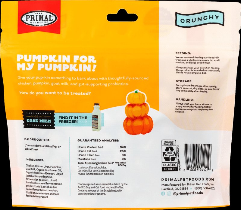 Primal Freeze Dried Dog Treats; Chicken & Pumpkin Dog Treats with Goat Milk for Dogs, Pumpkin for My Pumpkin, Grain Free Training Treats for Dogs with Probiotics, 2 oz