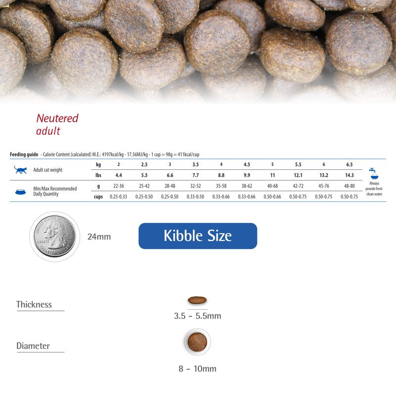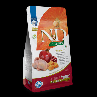 Farmina N&D Pumpkin Quail & Pomegranate Neutered is formulated to meet the nutritional levels established by the AAFCO Cat Food Nutrient Profiles for maintenance ingredients Fresh quail (32%), dehydrated quail (30%), pea starch, dehydrated pumpkin (5%), dehydrated whole eggs, chicken fat, fresh herring, dehydrated herring, herring oil, dried carrots, sun-cured alfalfa meal, inulin, fructooligosaccharides, yeast extract (source of mannan-oligosaccharides), dehydrated pomegranate (0.5%), dehydrated apple, dehydrated spinach, psyllium (0.3%), dehydrated sweet orange, dehydrated blueberry, salt, brewers dried yeast, turmeric (0.2%), glucosamine, chondroitin sulfate, vitamin A supplement, vitamin D3 supplement, vitamin E supplement, ascorbic acid, niacin, calcium pantothenate, riboflavin, pyridoxine hydrochloride, thiamine hydrochloride, biotin, folic acid, vitamin B12 supplement, choline chloride, betaâ€carotene, zinc methionine hydroxy analogue chelate, manganese methionine hydroxy analogue chelate, ferrous glycine, copper methionine hydroxy analogue chelate, DLâ€methionine, taurine, L-Carnitine, aloe vera extract, green tea extract, rosemary extract, mixed tocopherols (a preservative). ingredients and nutrition Supplemental information Nutritional additives: Vitamin A 18000IU; Vitamin D3 1200IU; Vitamin E 600mg; Vitamin C 300mg; Niacin 150mg; Pantothenic Acid 50mg; Vitamin B2 20mg; Vitamin B6 8.1mg; Vitamin B1 10mg; Vitamin H 1.5mg; folic acid 1.5mg; Vitamin B12 0.1mg; Choline Chloride 2800mg; Betaâ€Carotene 1.5mg; zinc chelate of the analogous methionine hydroxylase 910mg; manganese chelate of the analogous methionine hydroxylase 380mg; ferrous chelate of glycine hydrate 250mg; copper chelate of the analogous methionine hydroxylase 88mg; selenised yeast inactivated 0.40mg; DLâ€methionine 5000mg; Taurine 4000mg. Organoleptic additives: aloe vera extract 1000mg; green tea extract 100mg; rosemary extract. Antioxidants: tocopherolâ€rich extracts of natural origin. guaranteed analysis crude protein 46.00%; crude oils and fats 11.00%; crude fibres 5.50%; moisture (max) 8.00%; crude ash 8.70%; Calcium 1.50%; Phosphorus 1.30%; Omegaâ€6 2.00%; Omegaâ€3 0.45%; Docosahexaenoic Acid (DHA*) (min): 0.30%; Eicosapentaenoic Acid (EPA*) (min): 0.10%; Glucosamine* (min): 1200mg/kg; Chondroitin sulfate* (min): 900mg/kg. *Not recognized as an essential nutrient by the AAFCO Cat Food Nutrient Profiles. energy value EM Kcal/lb 1647 - Mj/lb 6.89 356 Kcal/cup KIBBLE COLOR DISCLAIMER Sometimes, the external appearance of the food may change in the different production batches since we only use natural ingredients, sometimes there may be variability in their color that is reflected also in the kibbles. Same animal species could have different meat colors, darker or lighter, and this is reflected in the kibbles color. Farmina does not use any artificial color to uniform different batches. Therefore, the occurrence of different shades of color in the kibbles is normal and does not affect the quality of the food, or its nutritional characteristics. For any further clarification don't hesitate and get in touch with your Genius Consultant. KIBBLE SIZE All the kibbles have a range for size, to ensure a correct fragmentation of the food. Although it is a rare occurrence, sometimes minimal variations inside the same bag are possible. As far as the kibbles are within the control range, everything is normal and as it should be. If you notice some kibbles out of the below ranges, please get in touch with your Genius Consultant because you could be eligible for the 100% Guarantee policy. KIBBLES SIZES: STARTER: Diameter 5-7 mm - Thickness: 4-5 mm PUPPY MINI: Diameter 8-10 mm - Thickness 4-6 mm PUPPY MEDIUM-MAXI: Diameter 12-14 mm - Thickness 5-7 mm ADULT MINI: Diameter 8-10 mm - Thickness 4-6 mm ADULT MEDIUM-MAXI: Diameter 14-17 mm - Thickness 8-10 mm ADULT MAXI-GIANT: Diameter 19-21 mm - Thickness 11-13 mm QUINOA MINI: Diameter 8-10 mm - Thickness 4-6 mm QUINOA MEDIUM-MA
