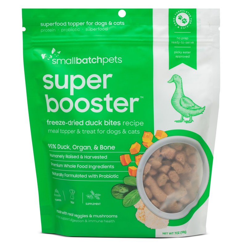 smallbatch Pets Freeze-Dried Super Booster Duck Bites for Dogs & Cats, 7 oz, Made in The USA, Organic Produce, Humanely Sourced Meat, Single Source Protein, Mixer & Topper, Mushrooms and Probiotics