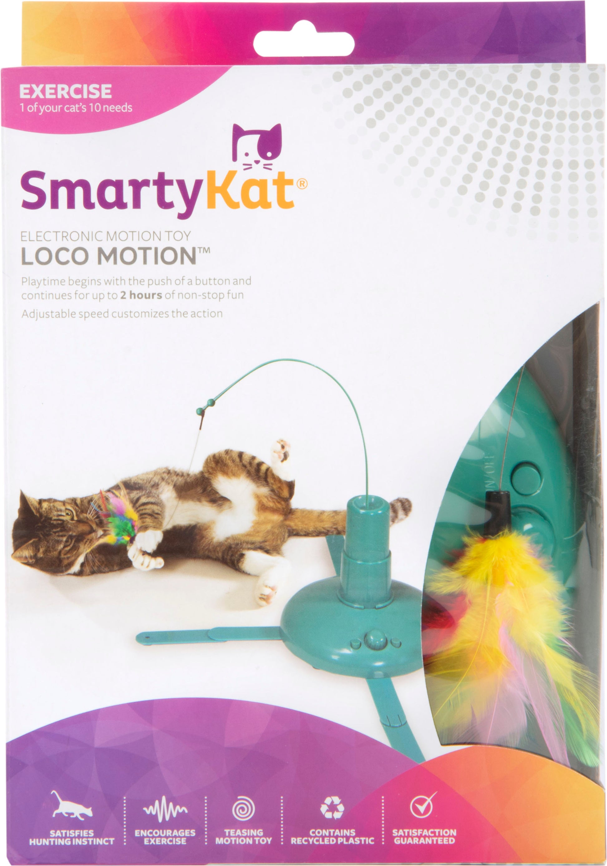 - The SmartyKat Loco Motion is an interactive electronic cat toy that gets cats moving with the exciting motion of flying feath
