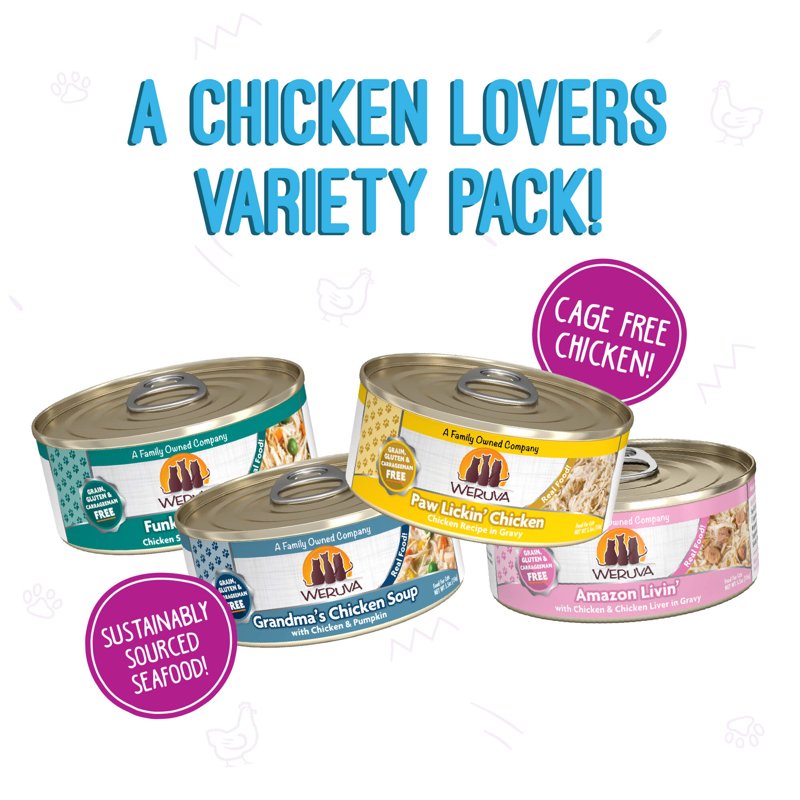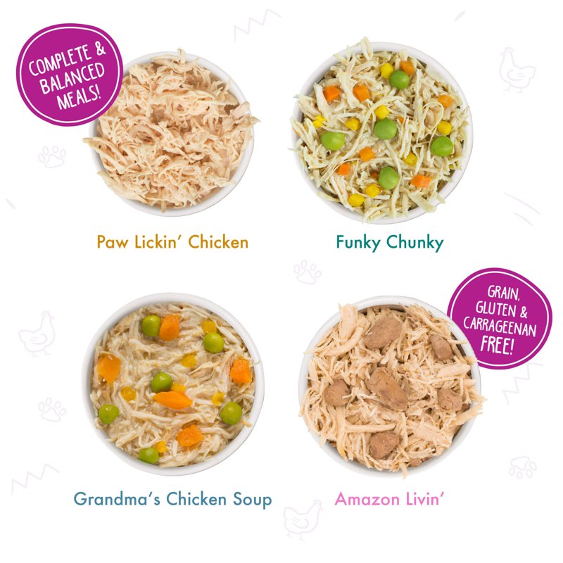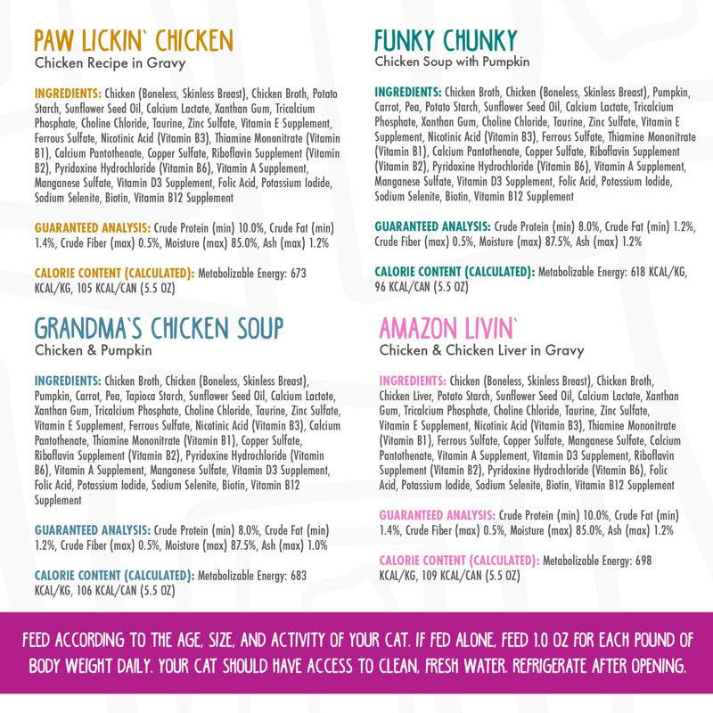 Ingredients The Meow You Doin'? Variety Pack includes 3 each of: Paw Lickin' Chicken, Funky Chunky, Grandma's Chicken Soup, and Amazon Livin'. Paw Lickin' Chicken: Ingredients: Chicken (Boneless, Skinless Breast), Chicken Broth, Potato Starch, Sunflower Seed Oil, Calcium Lactate, Xanthan Gum, Tricalcium Phosphate, Choline Chloride, Taurine, Zinc Sulfate, Vitamin E Supplement, Ferrous Sulfate, Nicotinic Acid (Vitamin B3), Thiamine Mononitrate (Vitamin B1), Calcium Pantothenate, Copper Sulfate, Riboflavin Supplement (Vitamin B2), Pyridoxine Hydrochloride (Vitamin B6), Vitamin A Supplement, Manganese Sulfate, Vitamin D3 Supplement, Folic Acid, Potassium Iodide, Sodium Selenite, Biotin, Vitamin B12 Supplement